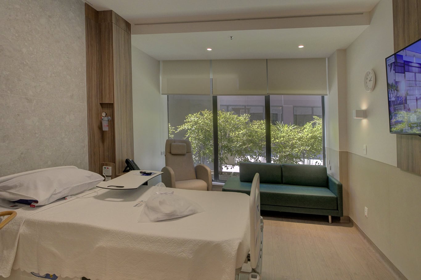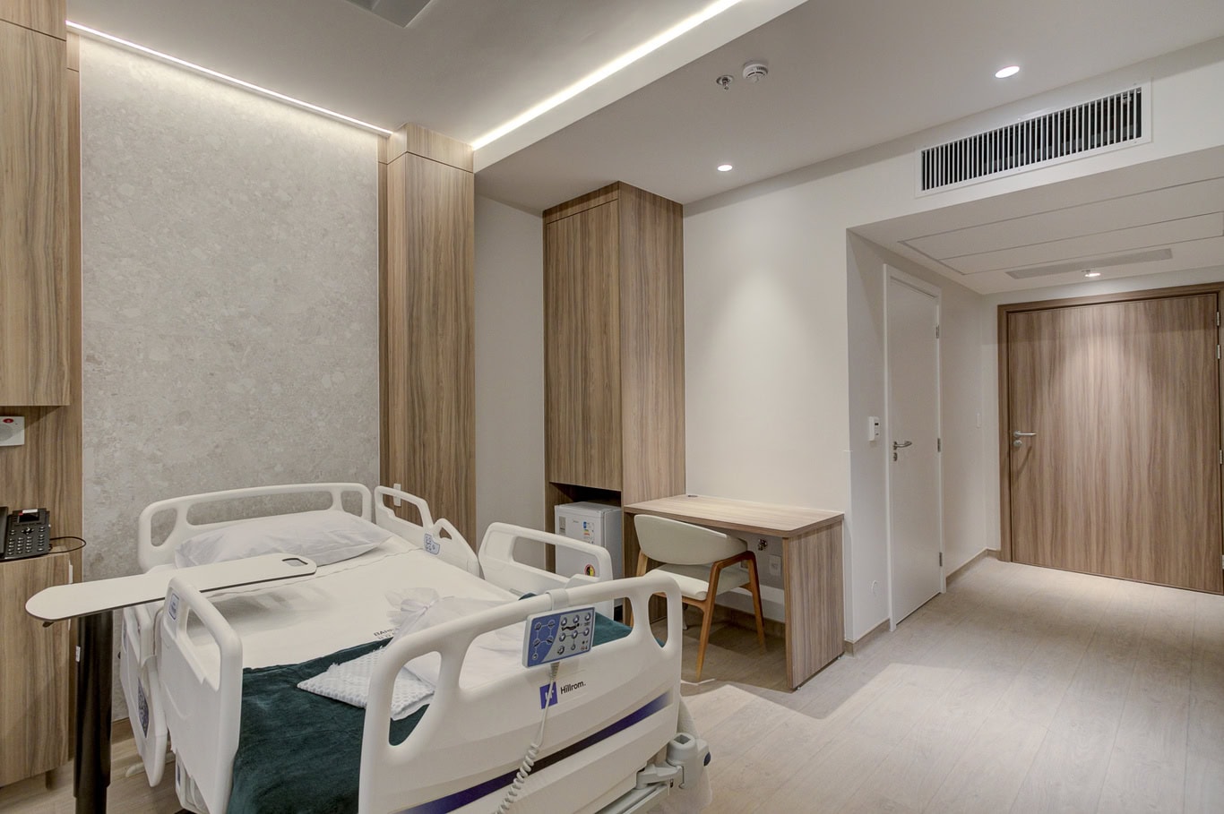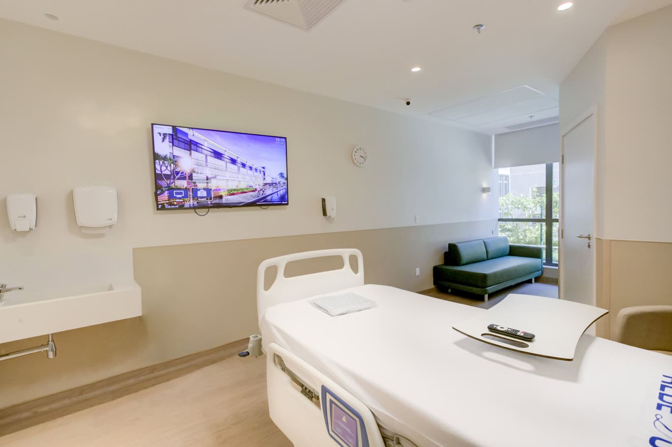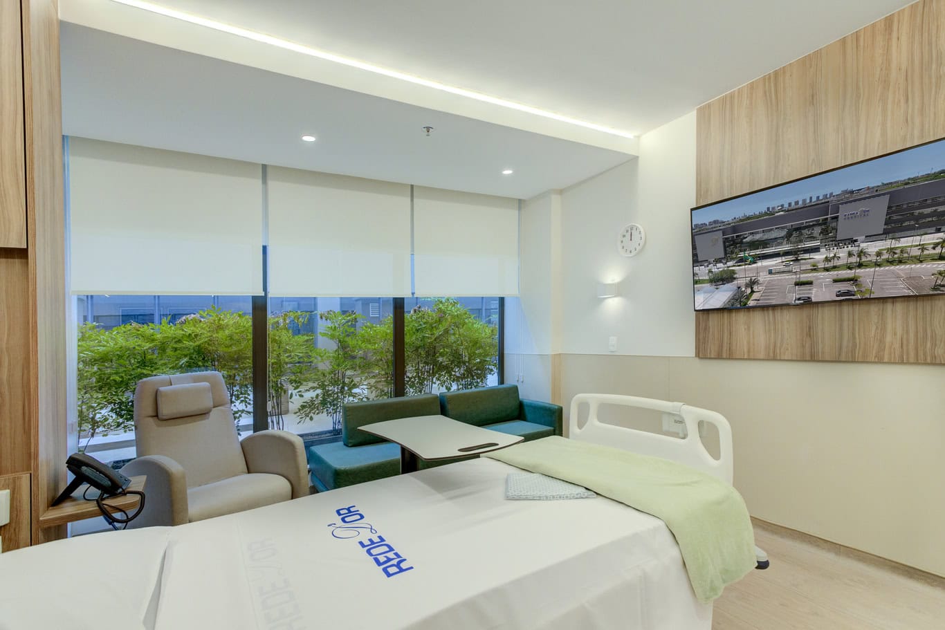 Os pacientes internados no Barra D’Or têm acesso a quartos amplos, iluminados naturalmente, com espaços externos para circulação, promovendo uma recuperação mais leve e acolhedora.