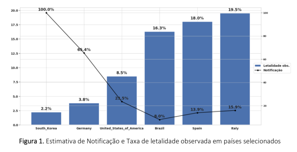 Partindo da relação entre os índices esperados (CRF base) e o índices reais (CRF observada), os resultados do estudo indicaram, preliminarmente, que as notificações brasileiras são de apenas 8,0% (entre 7,8% e 8,1%). Para deixar ainda mais claro a necessidade de testagem no país, os pesquisadores compararam as notificações com a taxa de letalidade em outros países, mostrando que quanto menor o registro de casos, maior é o índice de mortalidade da doença (Figura 1).