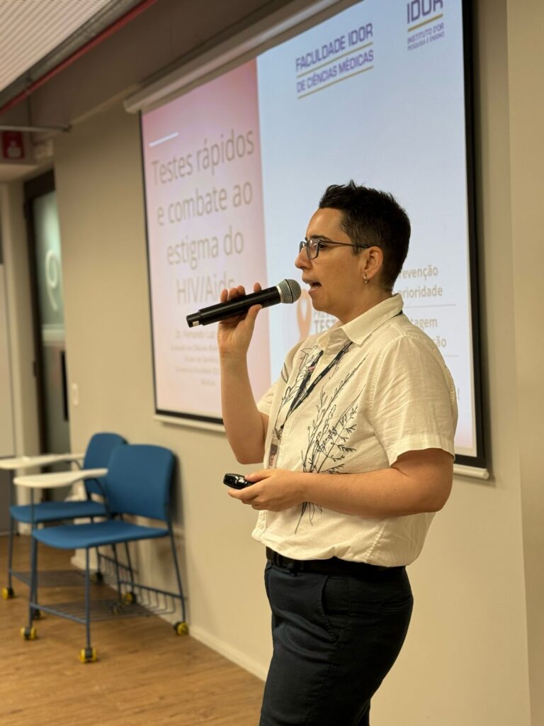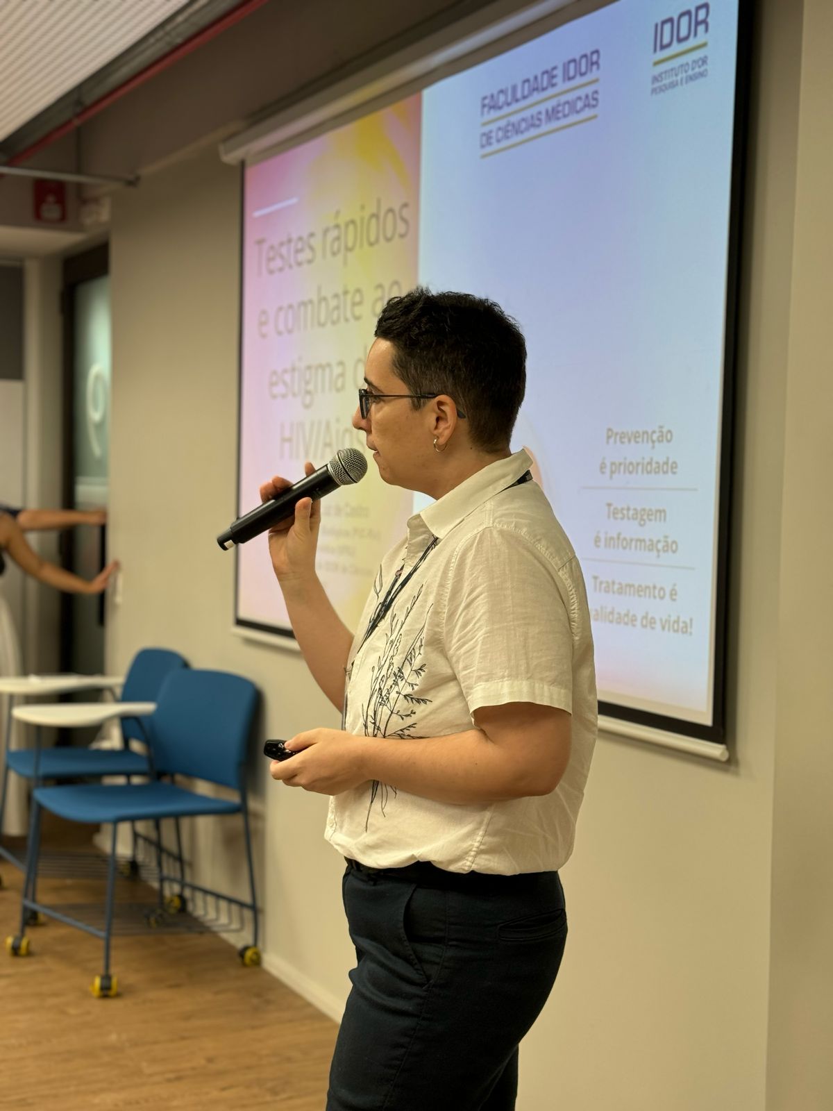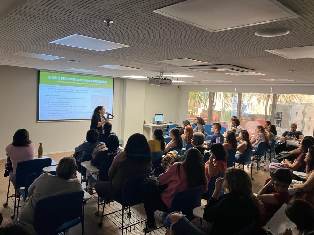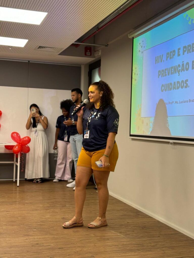 A professora Luciana abordou a prevenção do HIV, explicando sobre PEP (Profilaxia Pós-Exposição) e PrEP (Profilaxia Pré-Exposição), além dos principais cuidados que devem ser adotados para a proteção individual e coletiva. Em seguida, o professor Fernando destacou a necessidade de combater o estigma do HIV/Aids, promovendo um debate reflexivo sobre preconceitos e desafios enfrentados por pessoas que vivem com o vírus.