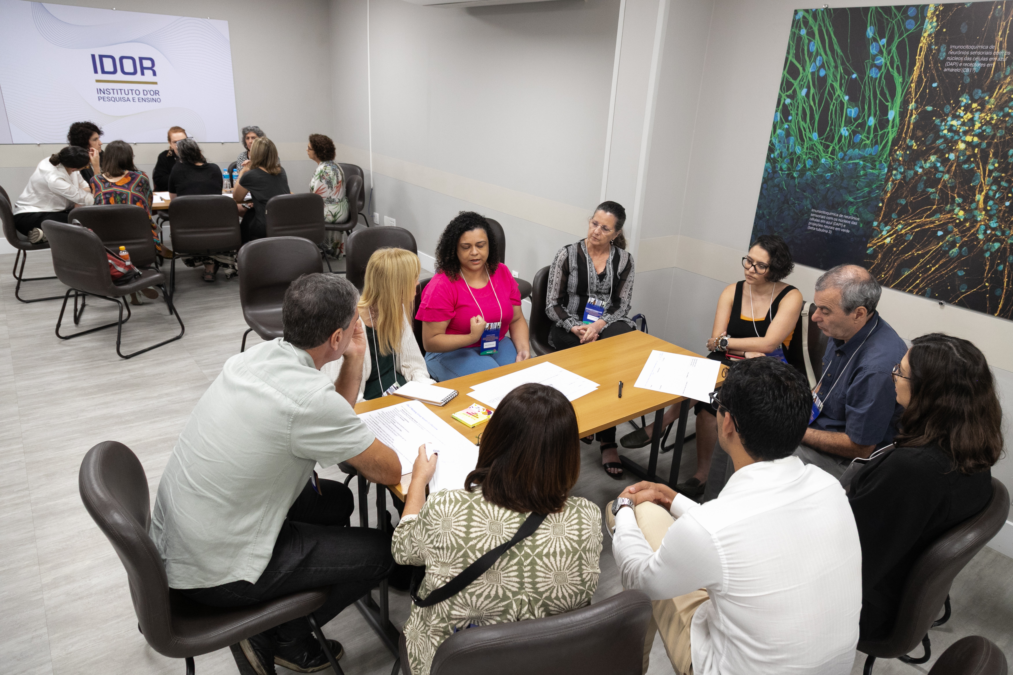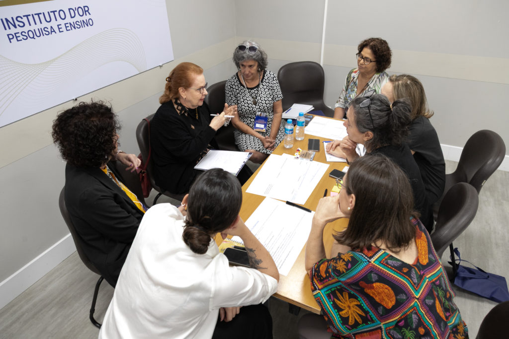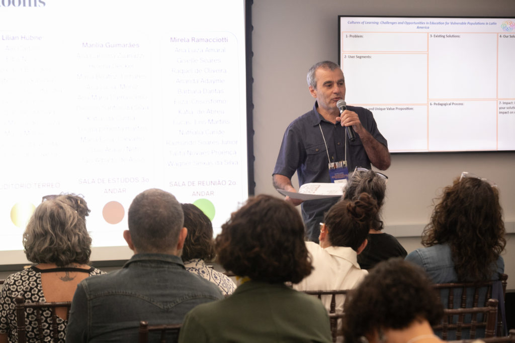 Depois dos painéis, participantes e palestrantes se reuniram em um workshop prático para transformar os aprendizados do dia em propostas concretas. Divididos em cinco grupos temáticos, cada um mediado por um especialista, os participantes trabalharam em soluções para desafios urgentes enfrentados por escolas no Brasil e em outros países latino-americanos.