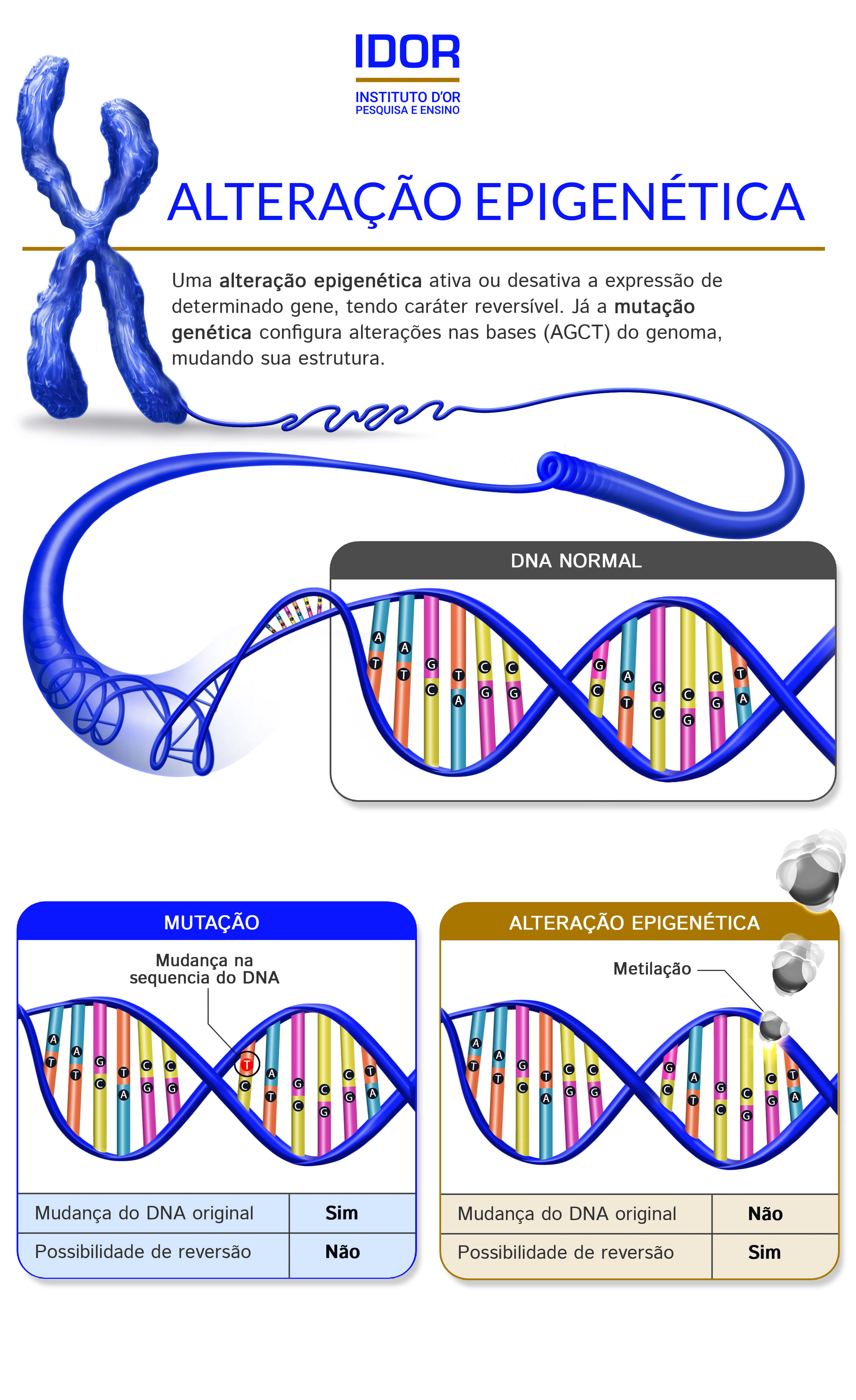 “Quando a gente fala em alteração genética, implica necessariamente em uma mutação, uma mudança na sequência das bases que compõem o DNA. A epigenética não é isso”, inicia o Dr. Arnaldo Prata, médico pediatra, docente, pesquisador e coordenador da área de pediatria do IDOR. “Se todas as células do nosso corpo têm todos os genes, o nosso DNA completo, como se transformam em células específicas, seja um cardiomiócito no coração, ou um neurônio? Para isso, são desativados os inúmeros genes que não são de interesse para a função daquela célula específica, e só funcionam os genes gerais de funcionamento celular e os relativos àquela especificidade. Essa ativação e desativação é um processo que não causa mutação do DNA, mas ainda assim é capaz de causar impactos relevantes, que podem ser inclusive transmitidos de pais para filhos. Isso é epigenética.”, explica.