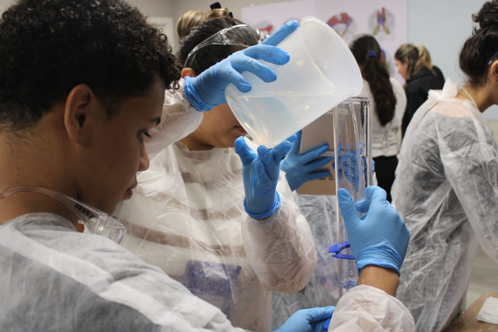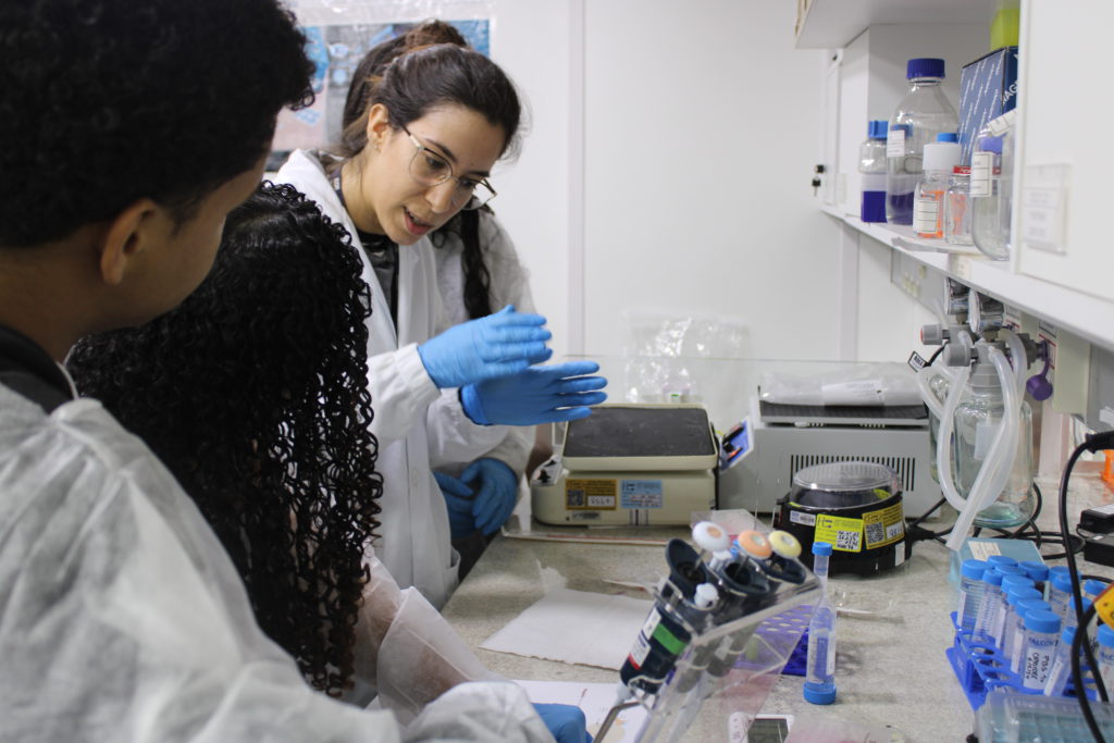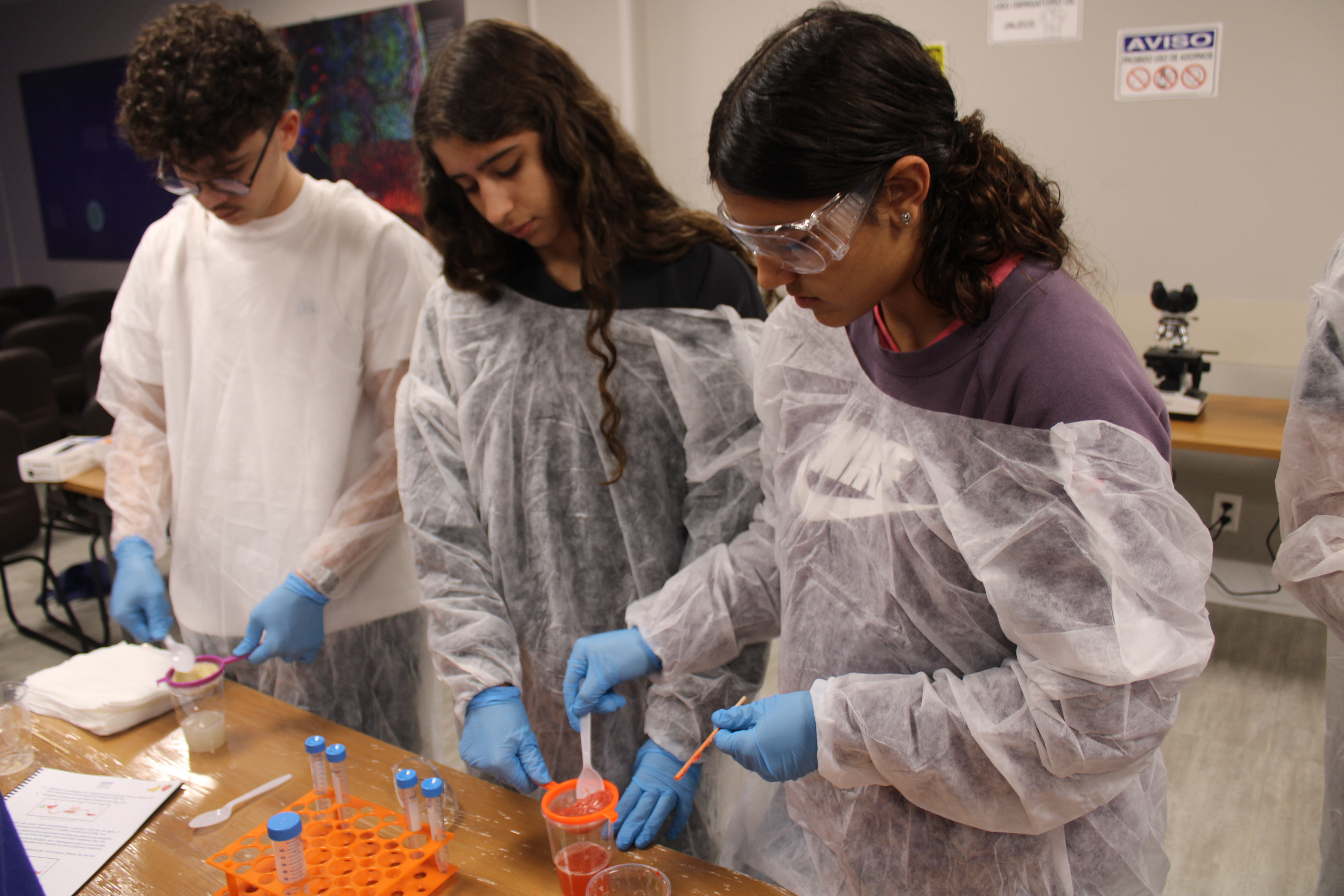De forma lúdica, a oficina apresentou aos alunos a vivência de uma prática essencial em um Laboratório de Biologia Molecular: a extração do DNA. Para o experimento, foram utilizados banana e morango e reagentes que fazem parte do dia a dia dos alunos no ambiente domiciliar, como detergente e sal, o que estimula ainda mais a interação e curiosidade.