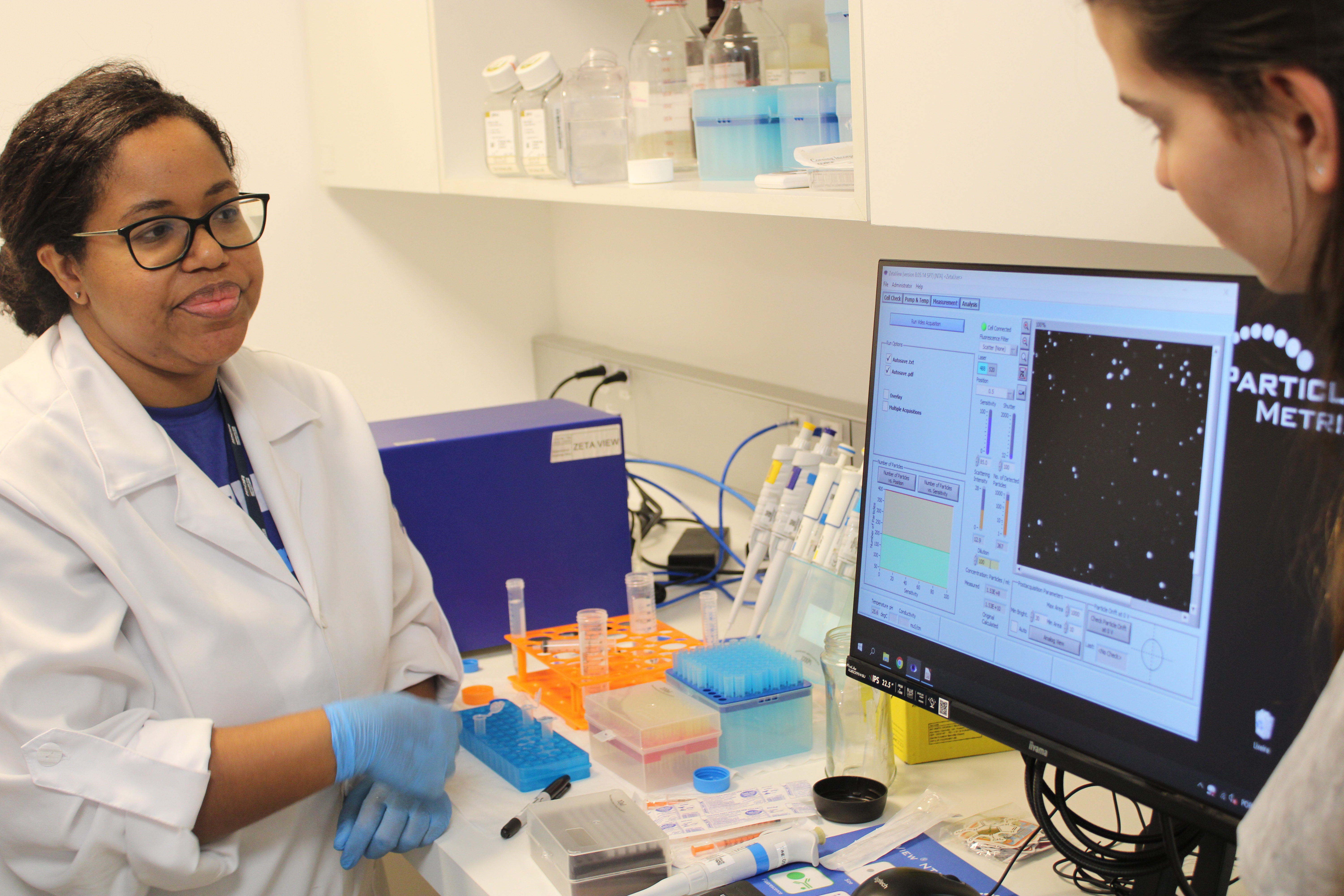 Na oficina de nanopartículas, os alunos utilizaram o equipamento ZetaView para rastrear microvesículas em uma imagem parecida com um céu estrelado. A atividade introduziu conceitos da medicina de precisão e técnicas de análise molecular.