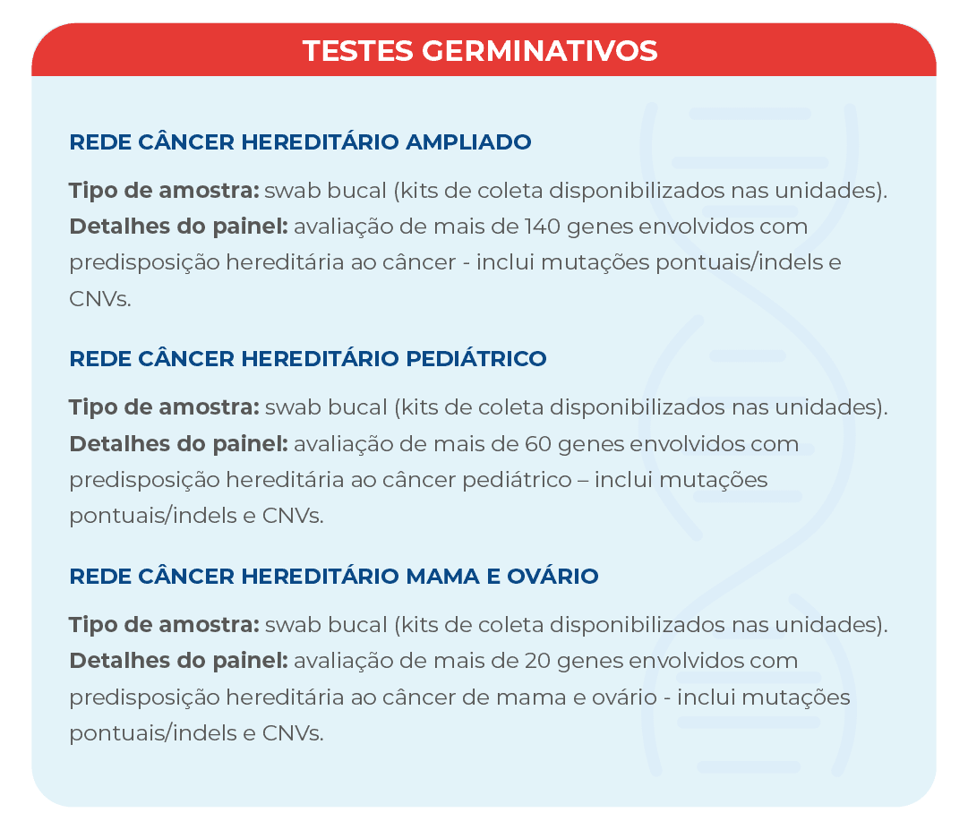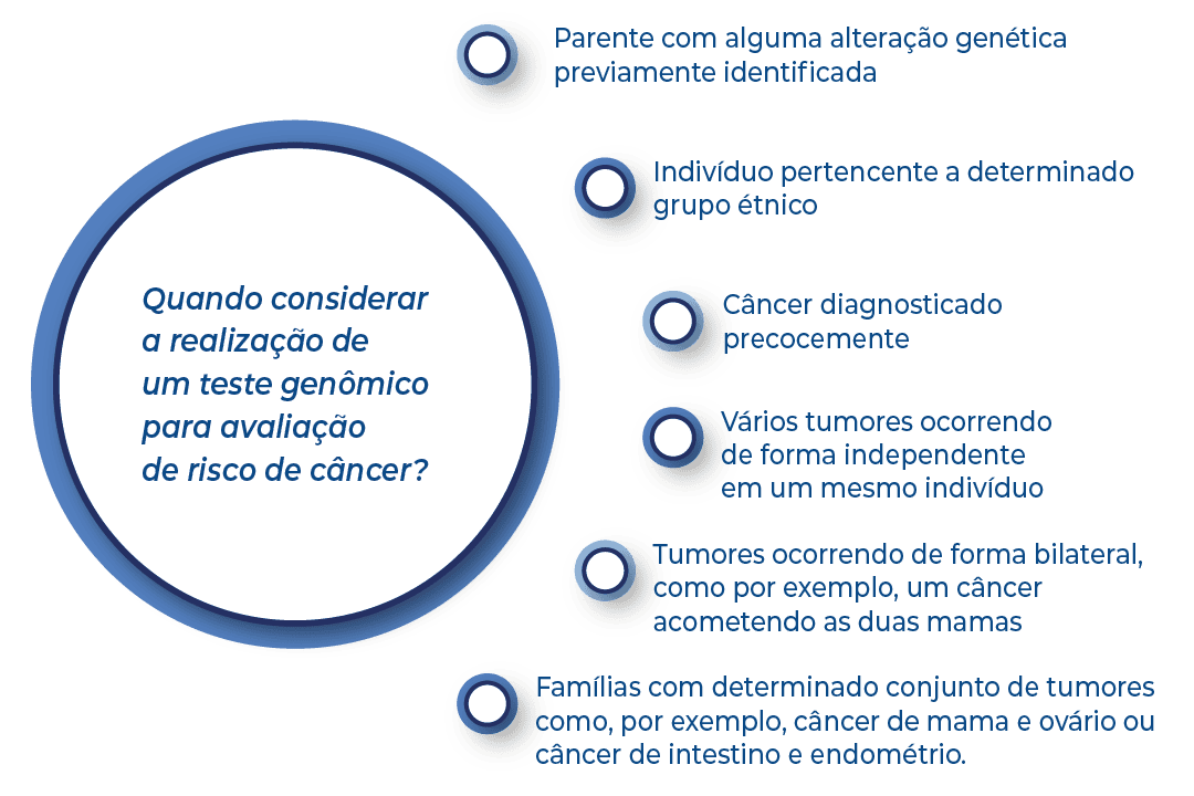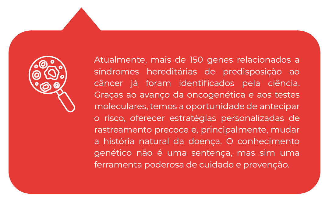 Determinadas famílias apresentam uma predisposição genética aumentada que eleva o risco de surgimento de alguns tipos de câncer, como, por exemplo, de mama, ovário, intestino ou próstata. Esses casos costumam apresentar padrões característicos, como: diagnóstico precoce (antes dos 50 anos), ocorrência do mesmo tipo de câncer em vários parentes próximos, combinação de tumores relacionados (como mama e ovário) ou presença de tumores raros, como câncer de mama em homens. Quando esses sinais de alerta estão presentes, pode-se indicar a realização de testes moleculares.
