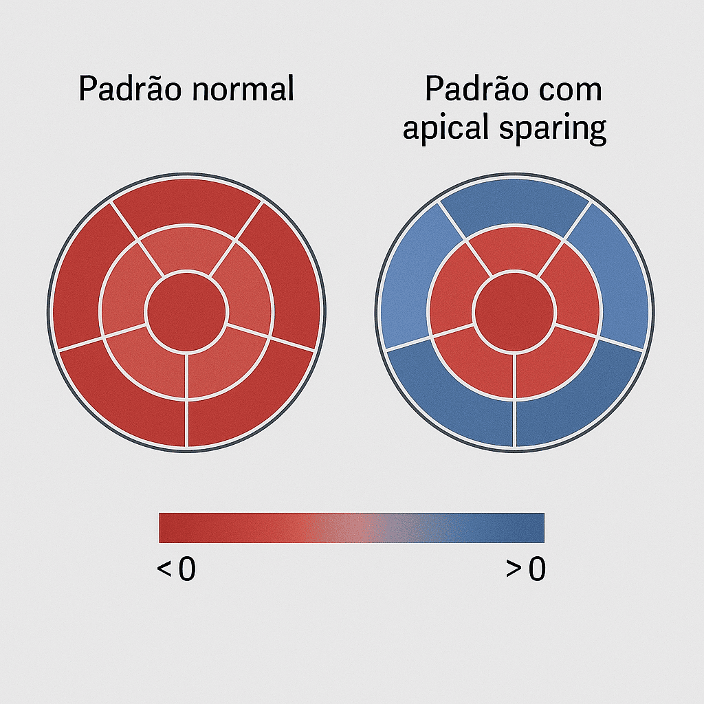‘Strain’ significa deformação e representa a variação percentual do comprimento das fibras musculares durante o ciclo cardíaco. A técnica rastreia ‘speckles’ (padrões naturais) no miocárdio, frame-by-frame, calculando a deformação nas direções longitudinal, circunferencial e radial. O principal parâmetro clínico é o strain longitudinal global (GLS), média ponderada da deformação longitudinal das 17–18 regiões do ventrículo esquerdo.