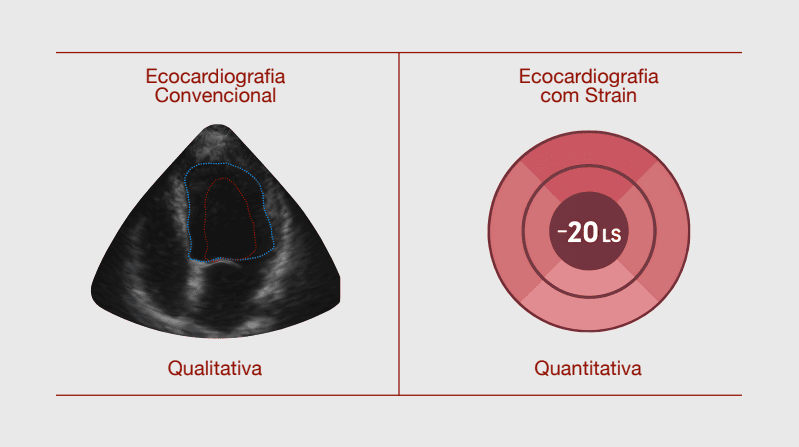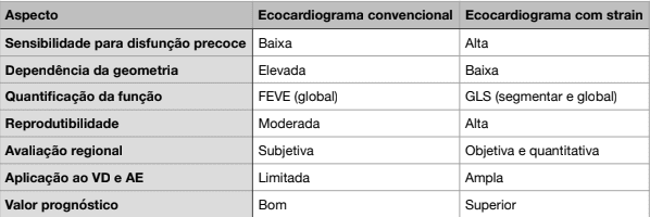 A ecocardiografia com strain complementa o ecocardiograma convencional, não o substitui. Em comparação ao método baseado apenas na FEVE, a complementação com strain oferece maior sensibilidade para disfunção precoce, menor dependência da geometria ventricular, melhor reprodutibilidade e avaliação regional quantitativa. A Tabela 1 resume essas diferenças.