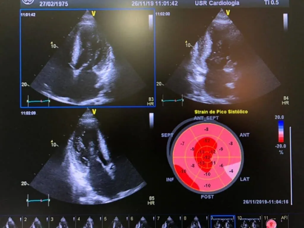 Global Longitudinal Strain: redução da deformação longitudinal encontrada em todos os segmentos, porém mais acentuada nos segmentos basais e mediais e relativamente preservada nos segmentos apicais.