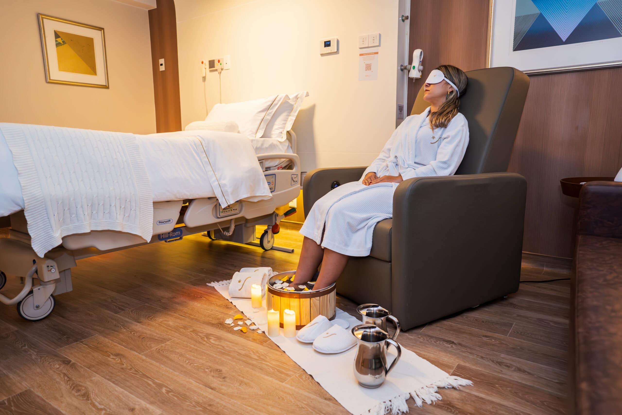 A experiência de internação é ainda mais personalizada com o sistema Smart Hospitality, que permite ao paciente controlar luzes, cortinas, TV, chamadas de enfermagem e cardápio por meio de um tablet.