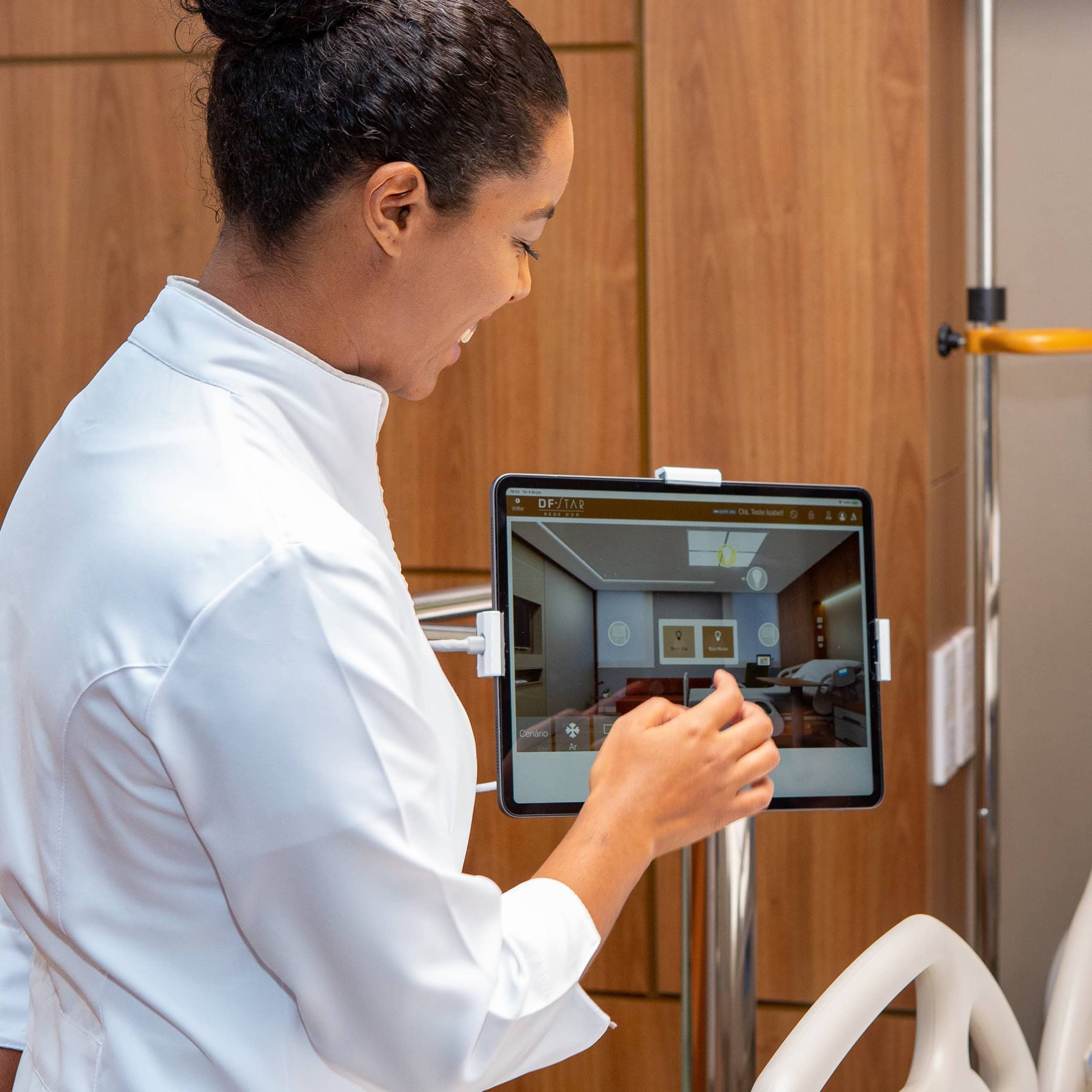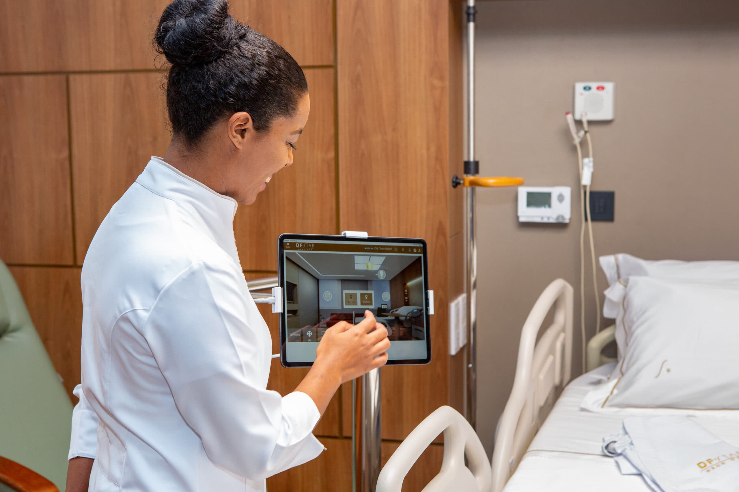 Os apartamentos do DF Star possuem amplas janelas, luz natural e decoração sofisticada. Cada detalhe foi pensado para tornar a estadia mais confortável, com itens como enxoval especial, amenities, frigobar e serviço de concierge. A tecnologia Smart Hospitality, exclusiva da linha Star, garante autonomia ao paciente para configurar o ambiente conforme suas preferências, respeitando os parâmetros técnicos da unidade.