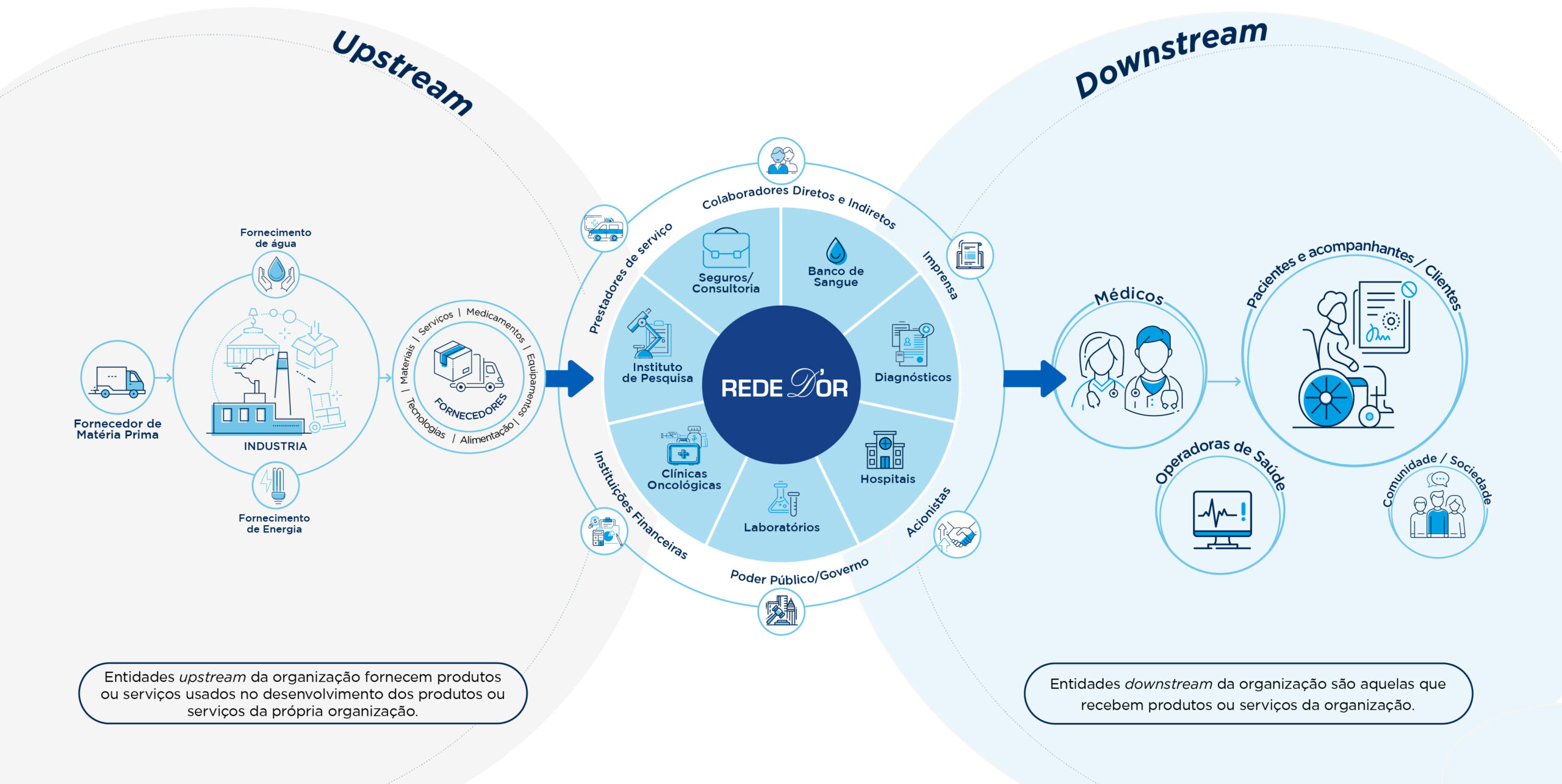 Com 45 anos de existência, somos a Rede D’Or São Luiz S.A. (razão social), uma sociedade anônima aberta de capital privado, constituída pela maior rede integrada de cuidados em saúde da América Latina e referência em qualidade técnica. Presente em 13 estados brasileiros e no Distrito Federal, temos nosso centro administrativo localizado em São Paulo (SP). Estamos enquadrados no setor de saúde suplementar e temos como foco o atendimento humanizado, a qualificação da equipe, a adoção de novas tecnologias e a expansão do atendimento. É possível verificar a descrição completa das principais atividades do Grupo no Formulário de Referência, bem como na Apresentação Institucional, documentos públicos atualizados anualmente. Nossas relações de negócios abrangem nossa cadeia de valor, que inclui parceiros de negócios, os quais são pessoas ou entidades com quem nos relacionamos. A cadeia de valor abrange conjunto de partes interessadas, o qual pode ser verificado na Política de Engajamento de Partes Interessadas e que estão sujeitos à aplicação das diretrizes previstas no Código de Conduta da Rede D’Or.