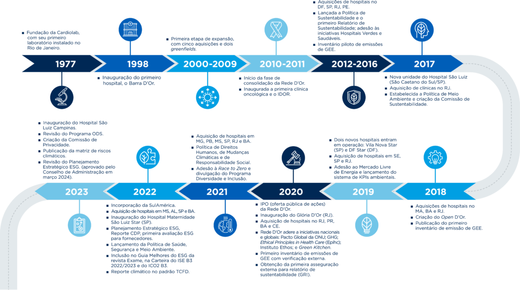 Além das unidades de saúde (hospitais, laboratórios e clínicas oncológicas), temos as operações da D’Or Consultoria, Instituto D’Or de Pesquisa e Ensino (IDOR) e SulAmérica, de abrangência nacional. Em comparação ao Relatório de Sustentabilidade 2022, a SulAmérica foi incorporada e seus indicadores foram dispostos no anexo Indicadores ESG SulAmérica.