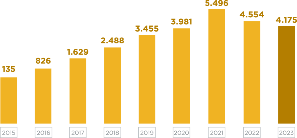 Em 2023, contamos com 21 unidades hospitalares com o mais avançado parque de cirurgia robótica da América Latina, sendo 19 hospitais com robôs próprios e dois com robôs não próprios.