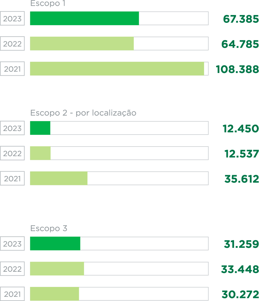 1 A intensidade de energia dentro da organização foi retificada de 0,82 GJ/pac.dia para 0,294 GJ/pac.dia para 2021; para 2022, de 0,87 GJ/pac.dia para 0,224 GJ/pac.dia, Ver mais detalhes na nota explicativa 6 do GRI 302-1. A intensidade fora da organização foi retificada em 2022, de 0,19 GJ/pac.dia para 0,00014 GJ/pac.dia. Ver mais detalhes na nota explicativa 3 do GRI 302-2 [GRI 2-4]. É possível notar que, até então, a energia fora da organização não é representativa em comparação à dentro da organização;
