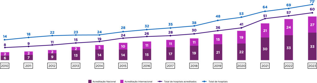 | % hospitais acreditados | 2023 | 2022 | 2021 | 2020 | 2019 | 2018 | 2017 | 2016 | 2015 | 2014 | 2013 | 2012 | 2011 | 2010 |