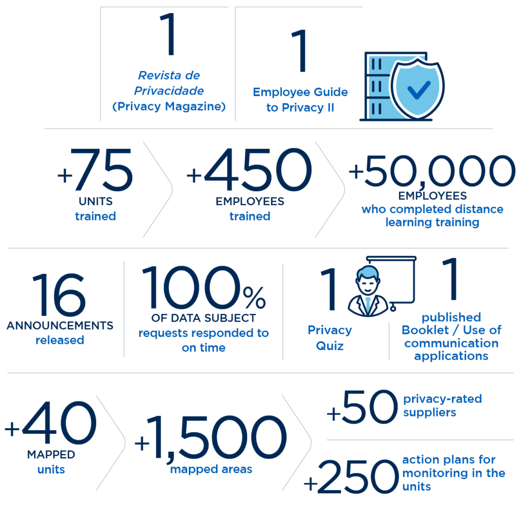 To engage our professionals in complying with the rules set out in the LGPD, we offer a training and awareness program focused on privacy. Throughout 2023, several actions were carried out in a structured manner, including more than 250 action plans to carry out monitoring in the units; distance learning training for more than 50,000 employees; publication of the Employee Guide to Privacy II; announcement; and launch of a biannual online magazine addressing the topic, among other initiatives. [GRI 3-3]