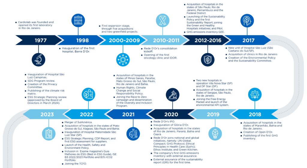 In addition to healthcare units (hospitals, laboratories, and oncology clinics), we operate D’Or Consultoria, Instituto D’Or de Pesquisa e Ensino (D’Or Institute for Research and Education) and SulAmérica, which have a nationwide presence. Compared to the 2022 Sustainability Report, we merged SulAmérica’s operations, whose indicators were included in the ESG Indicators attachment.