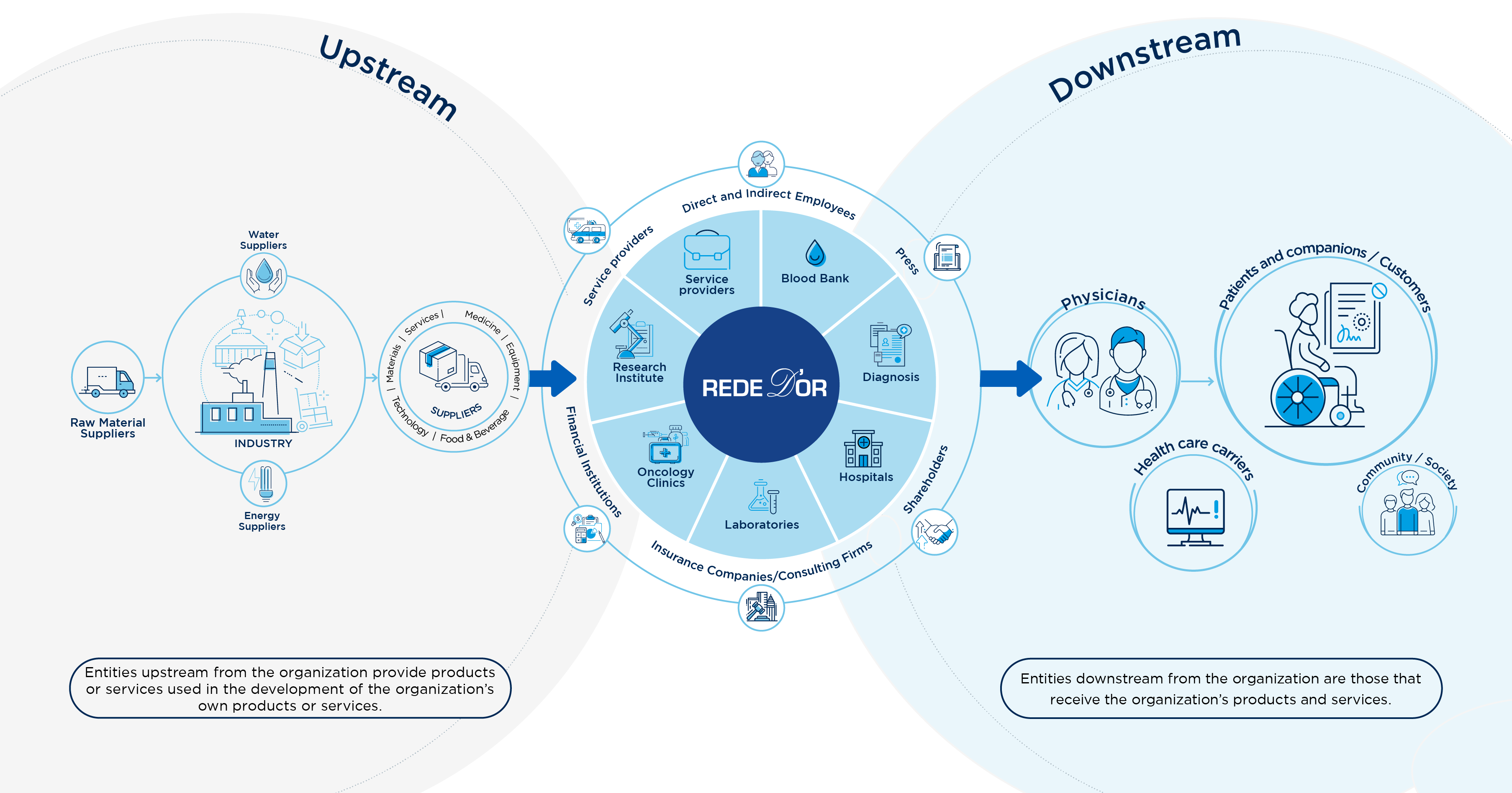 Operating for 45 years, we are Rede D’Or São Luiz S.A. (corporate name), a privately held, publicly traded Company that is a benchmark in technical quality and Latin America’s largest integrated healthcare network. We are present in 13 Brazilian states and the Federal District, and our administrative headquarters is located in São Paulo, SP. Part of the supplementary healthcare sector, we are focused on humanized care, team qualification, the adoption of new technologies, and the expansion of care. A full description of the Group’s main activities can be found in the Reference Form, and in the Institutional Presentation, publicly available documents that are updated annually. Our business relations cover our value chain, which includes business partners, which are people or entities with whom we have relationships. The value chain encompasses our stakeholders, which can be verified in the Stakeholder Engagement Policy and which are subject to the guidelines set out in Rede D’Or’s Code of Conduct.