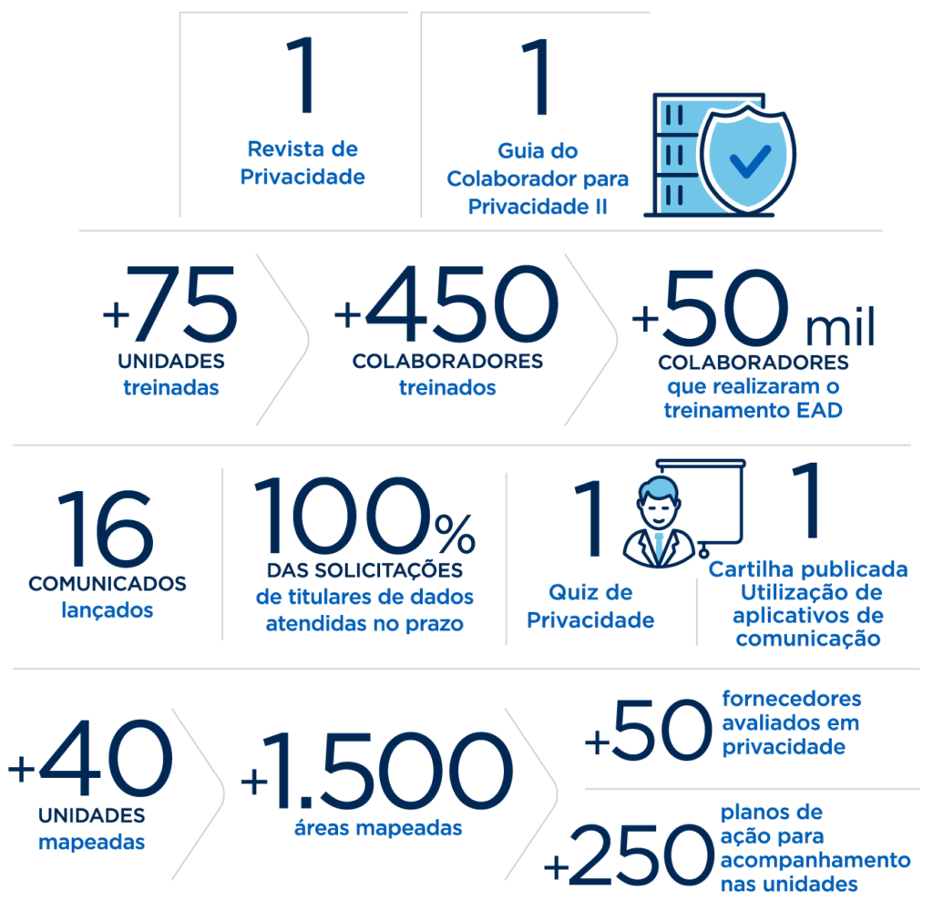 Para engajar nossos profissionais no cumprimento das regras dispostas na LGPD, mantemos um programa de treinamento e conscientização com foco em privacidade. Ao longo de 2023, foram realizadas diversas ações de forma estruturada, incluindo mais de 250 planos de ação para acompanhamento nas unidades; treinamento via EAD para mais de 50 mil colaboradores; publicação do Guia do Colaborador para Privacidade II; comunicados; e lançamento de uma revista on-line semestral abordando o tema, entre outras iniciativas. [GRI 3-3]