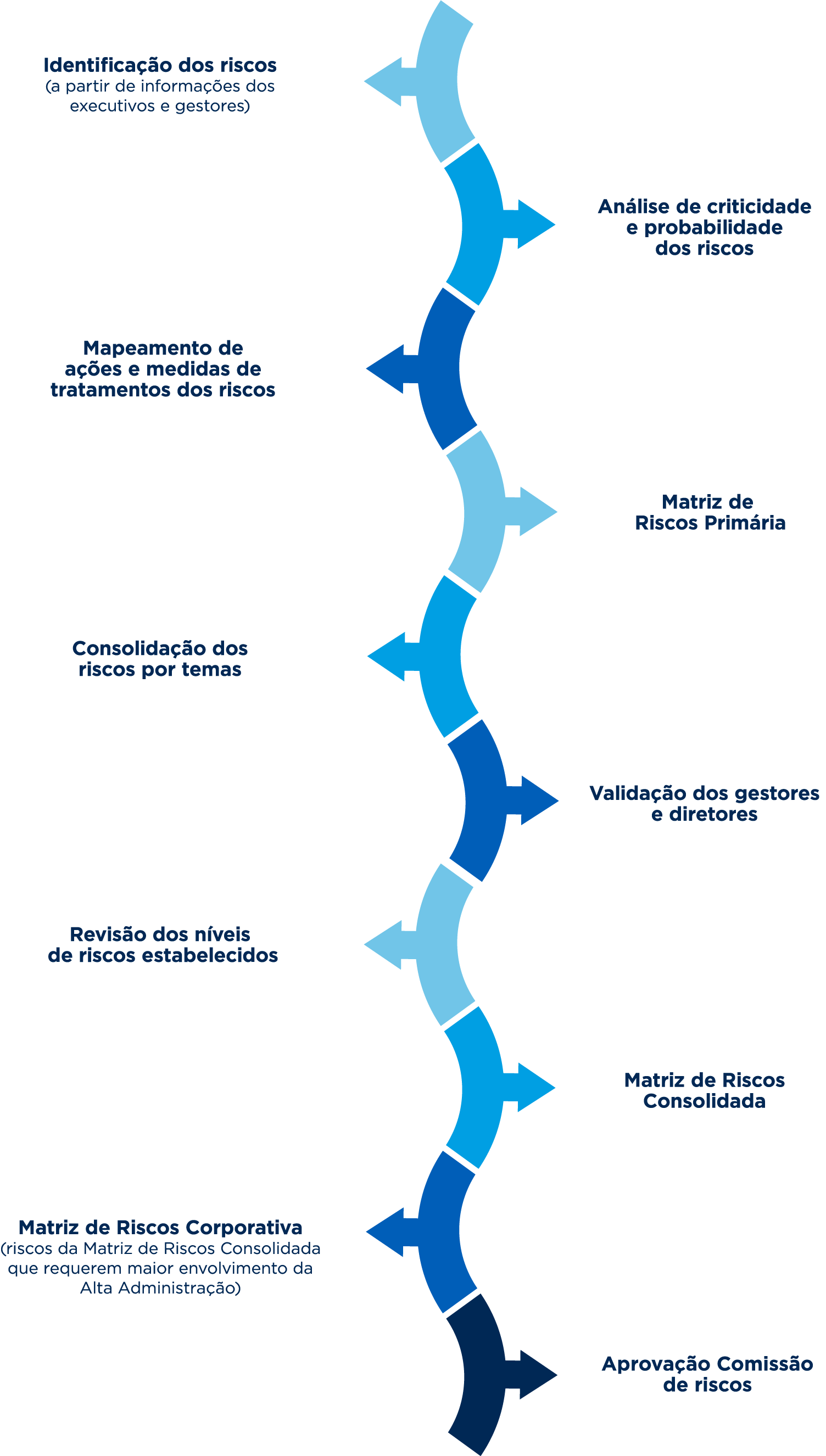 O ano de 2023 marca o alcance de maturidade e excelência na gestão de riscos em nossa Companhia, evidenciado pela participação ativa dos membros executivos no acompanhamento dos riscos, pelo envolvimento das diversas áreas que atuam na governança do processo e pela ampliação do alcance do processo de gestão de riscos em nossos negócios.